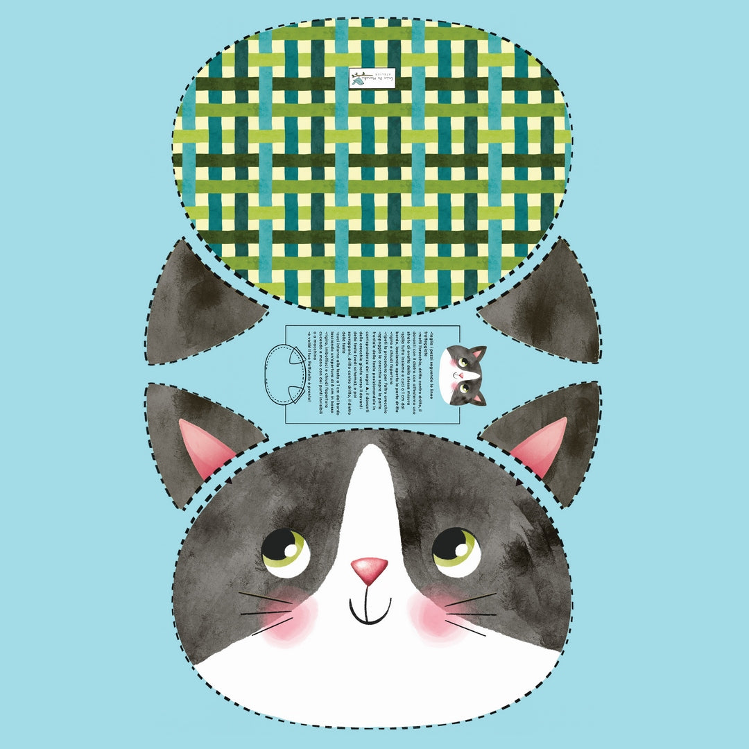In questo pannello di 75x50 cm ci sono tutti i pezzi necessari per creare un cuscino a forma di gatto. (testa davanti e dietro, orecchie davanti e dietro e istruzioni)