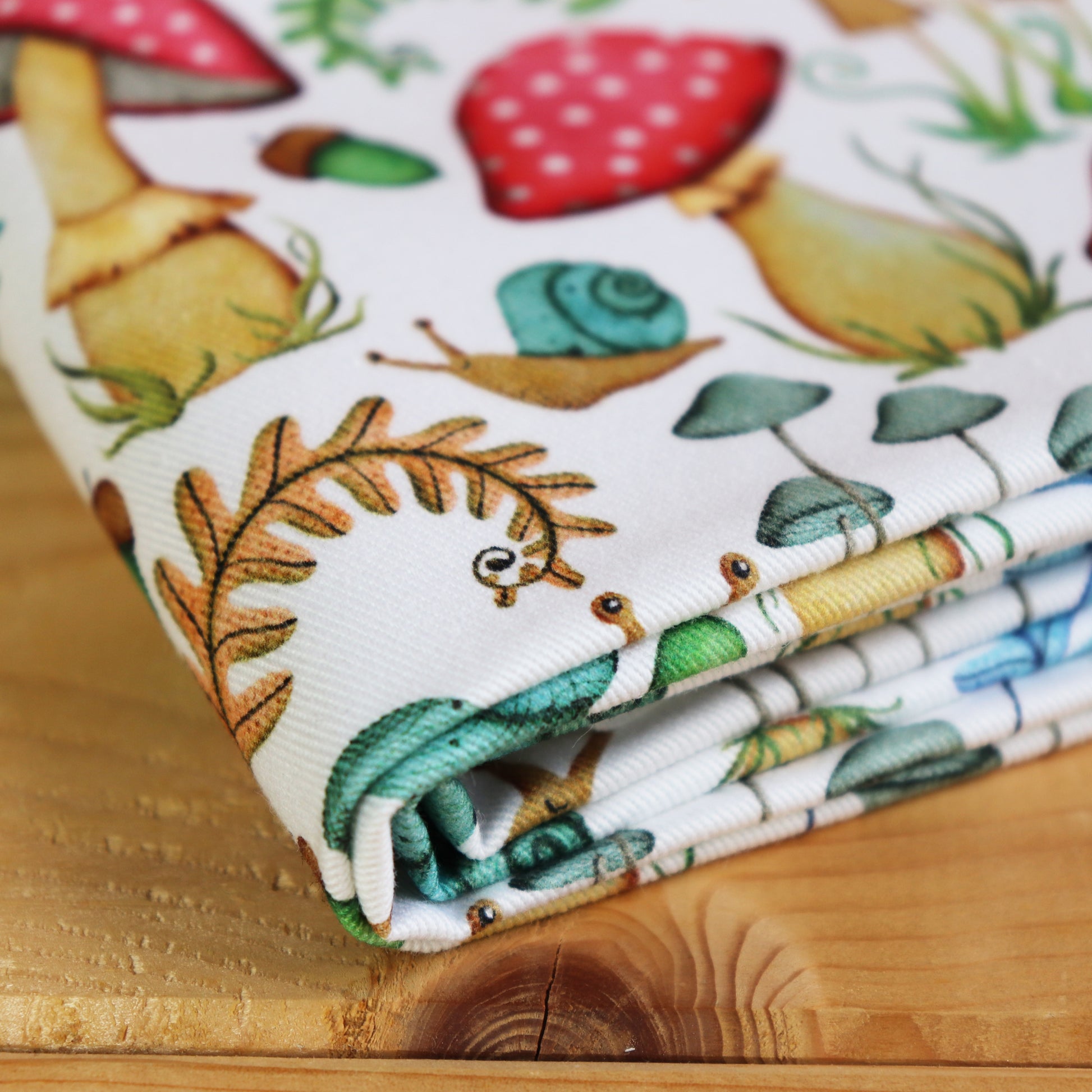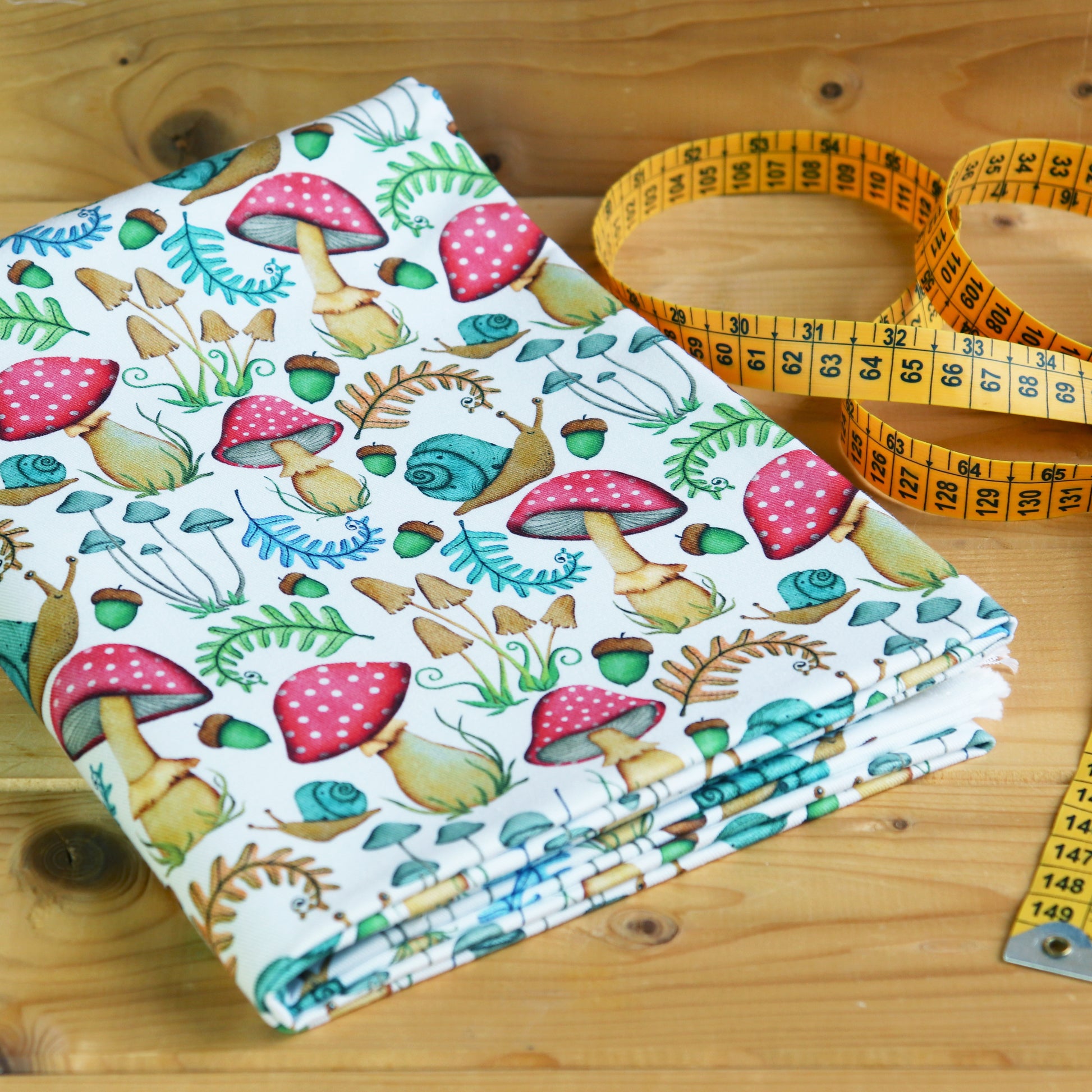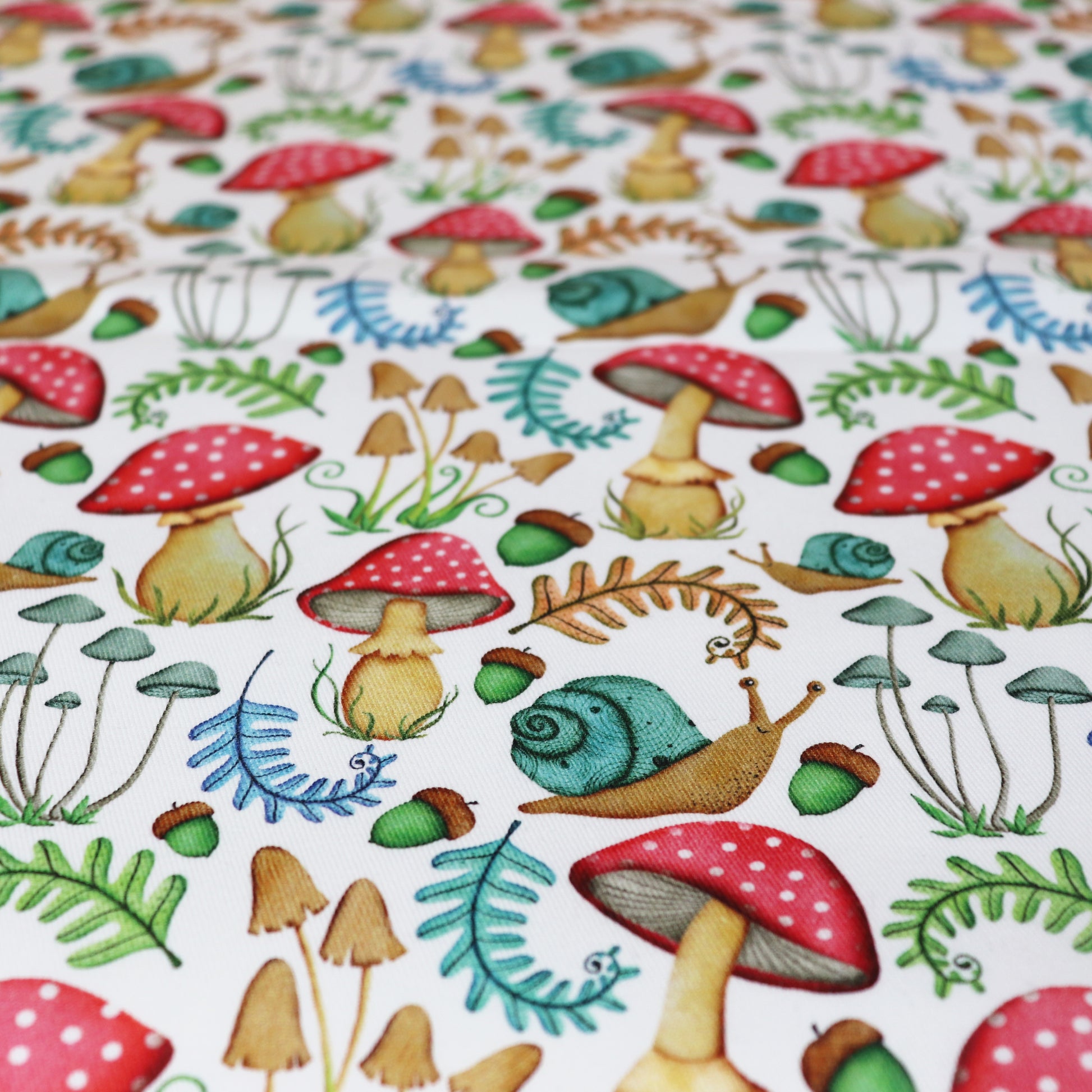 Tessuto in Gabardina di 100% Cotone: Funghi e Lumache su sfondo Bianco