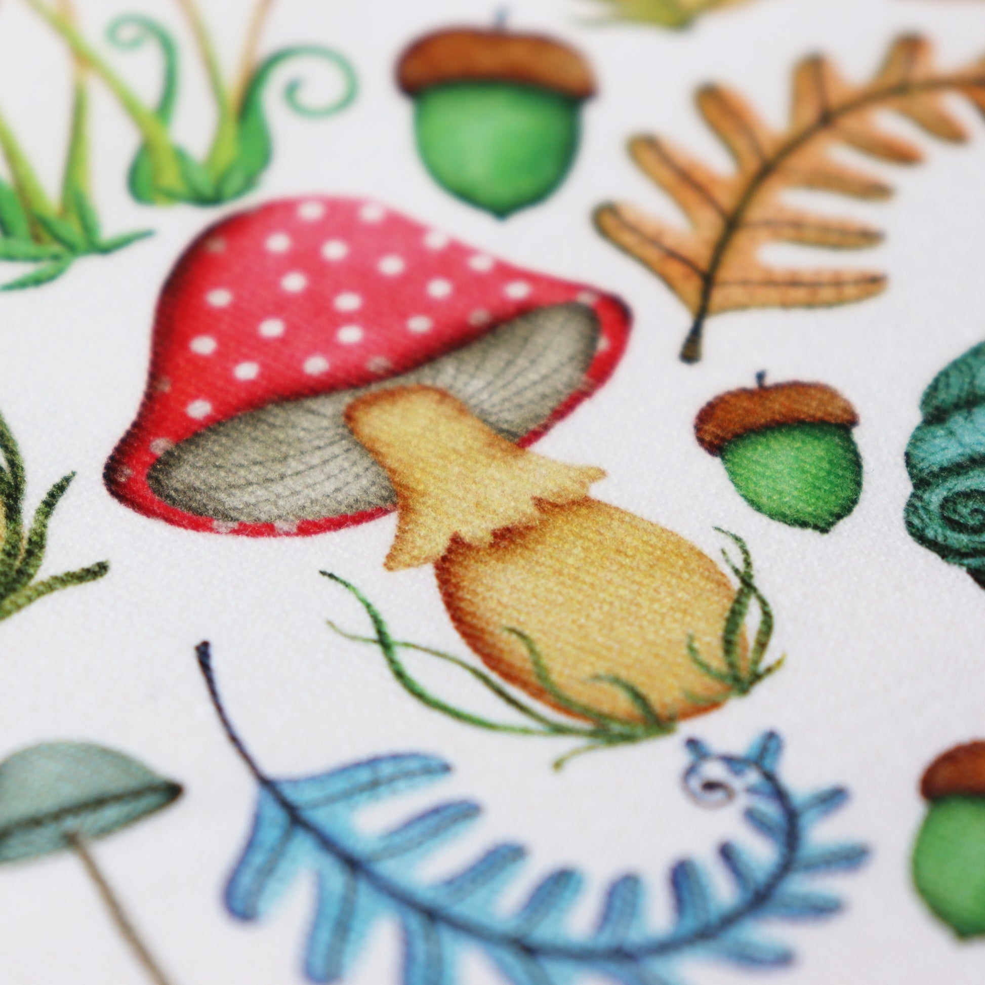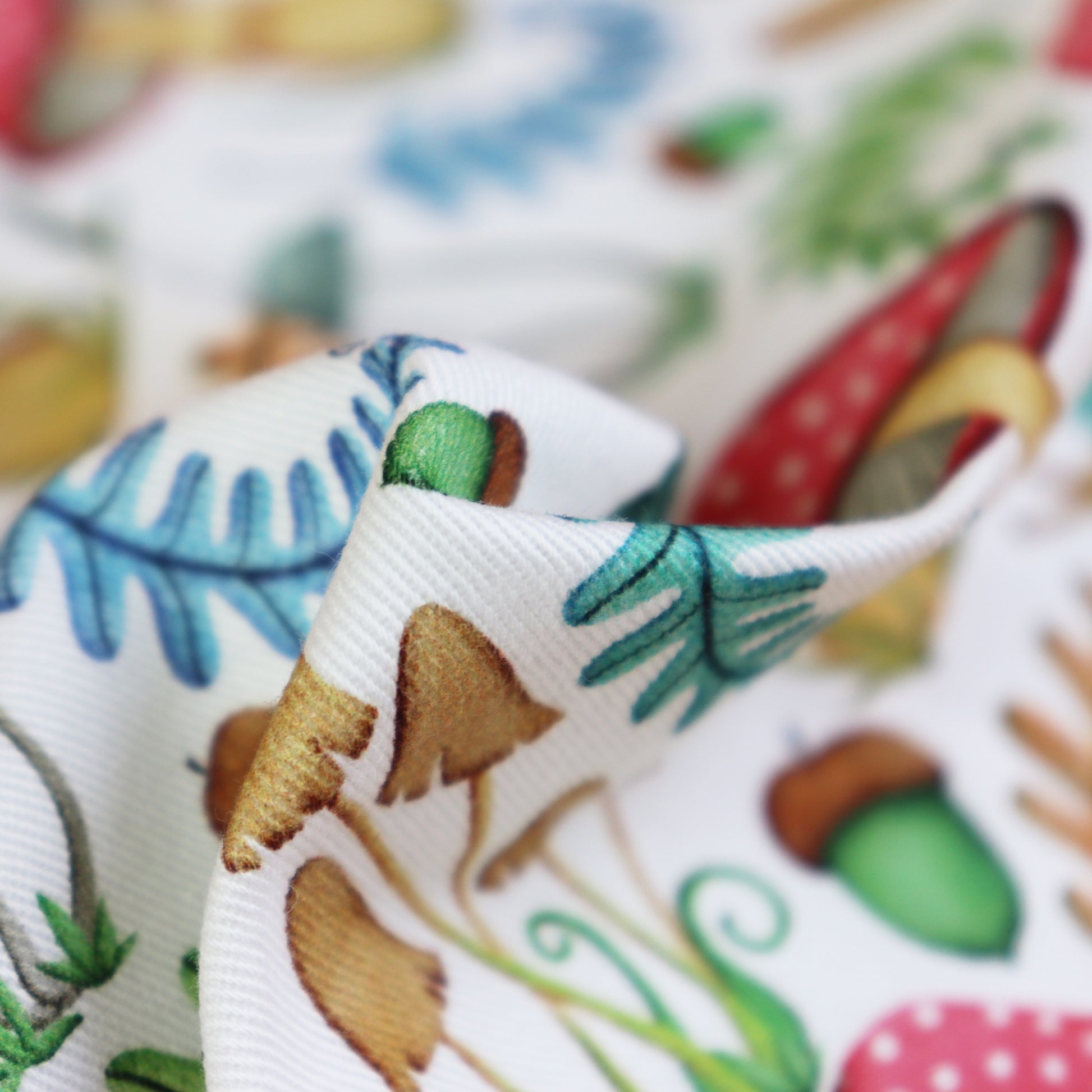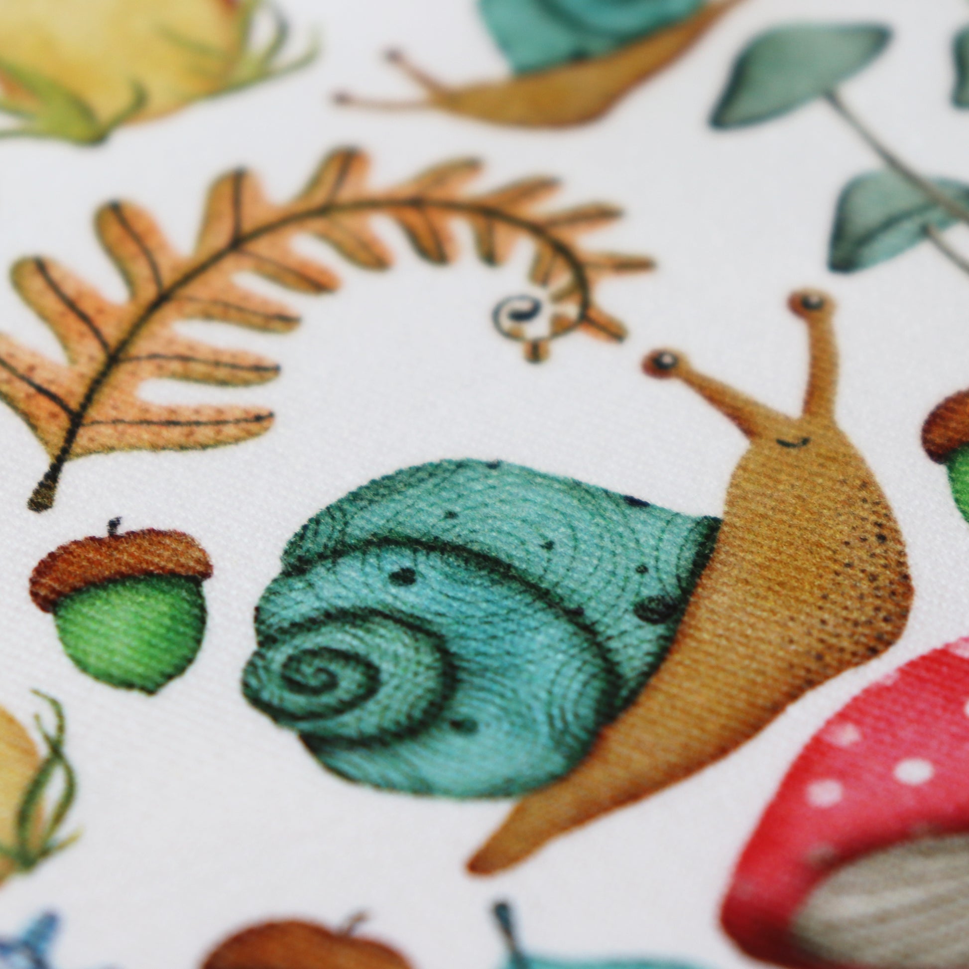 Tessuto in Gabardina di 100% Cotone: Funghi e Lumache su sfondo Bianco